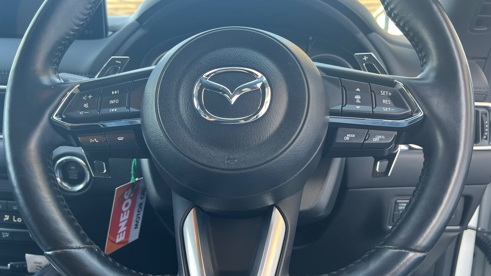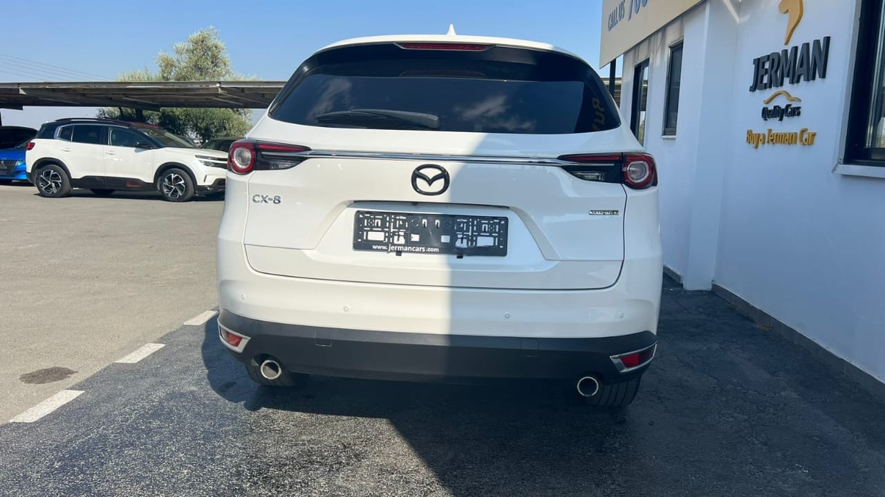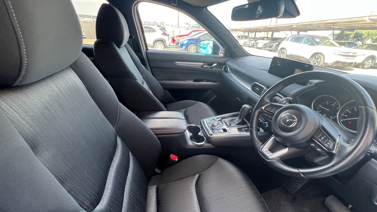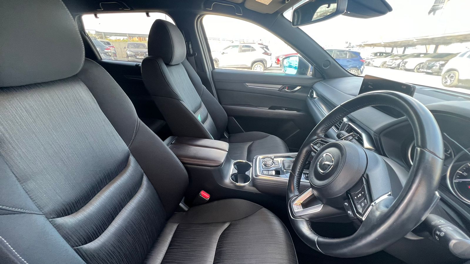 This Mazda CX-8 Proactive combines elegant design with advanced comfort and driver-focused technology. The interior shows high-quality leather details, a leather-wrapped steering wheel with multifunctional controls, and a premium stitched gear shifter. It offers a refined driving experience with practical features designed for convenience and safety. Ideal for families or long-distance driving, this is a practical yet elegant choice.