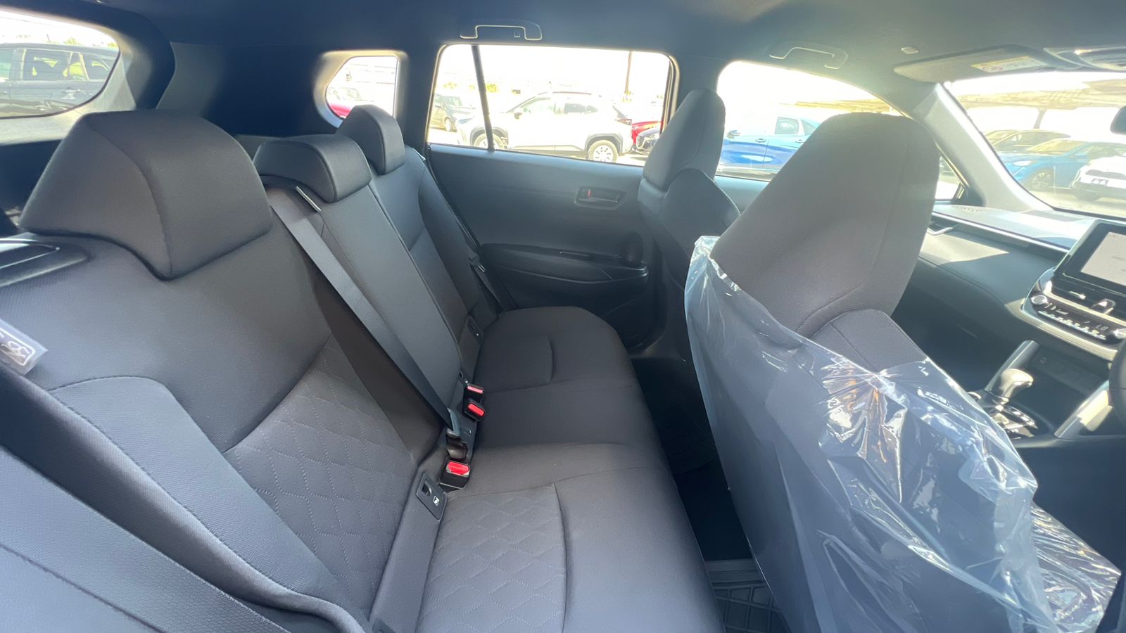 - Cloth seats with a patterned finish