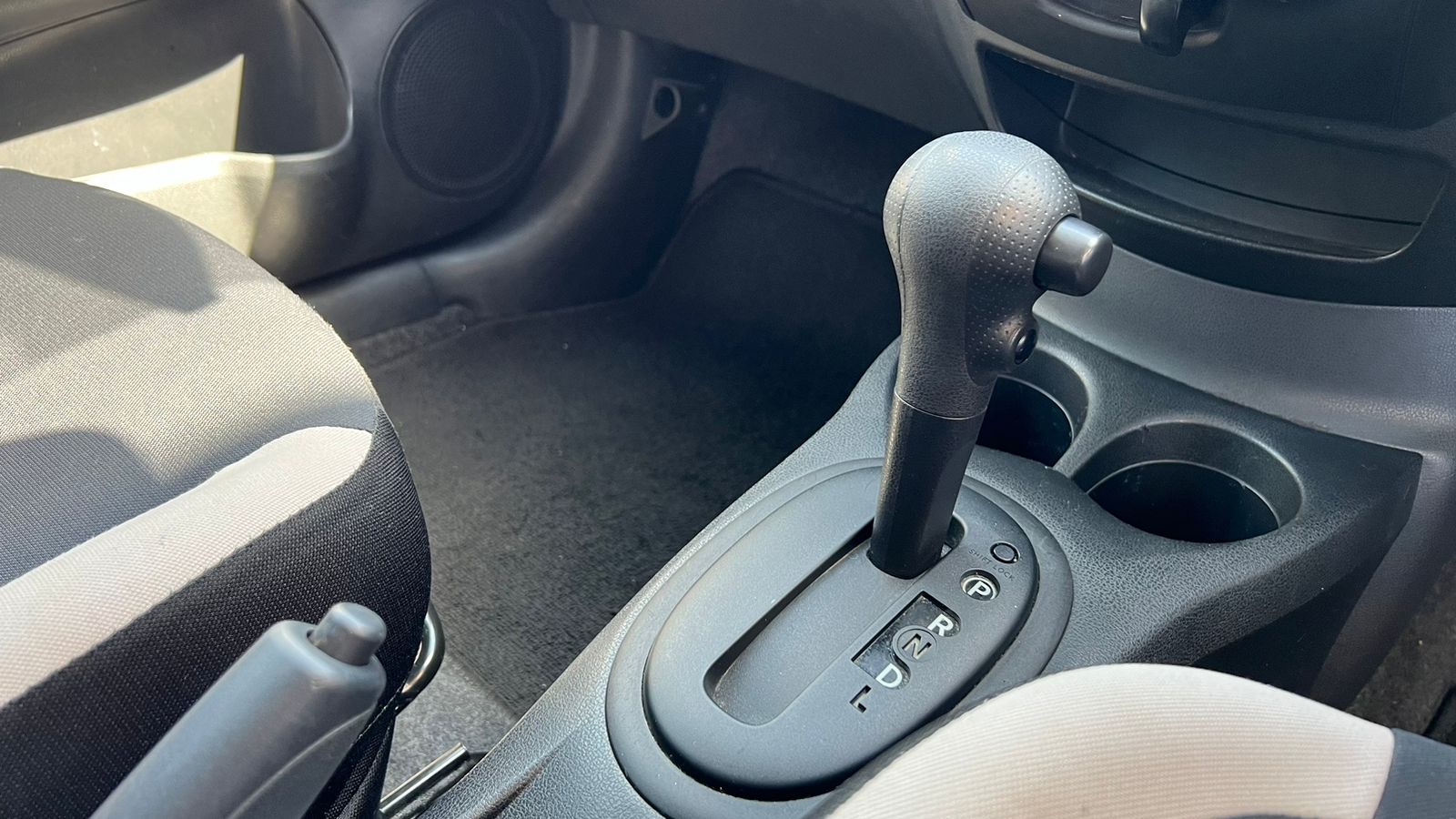 - Black fabric seats with patterned inserts and contrast stitching
